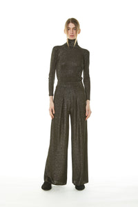 A high turtle-neck, long sleeved top created with thin and delicate metallic knit thread.
