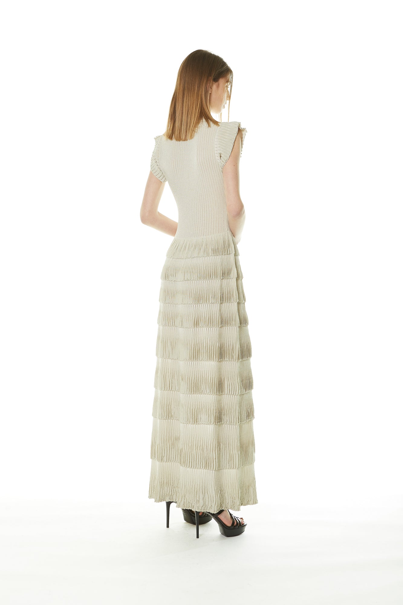 Sleeveless long dress with V-neck opening .The dress is created with specific knitting pattern a true symbiosis of lines and shapes. Due to the vertical drapes of the knit , the dress is moving dynamically around the feminine body.